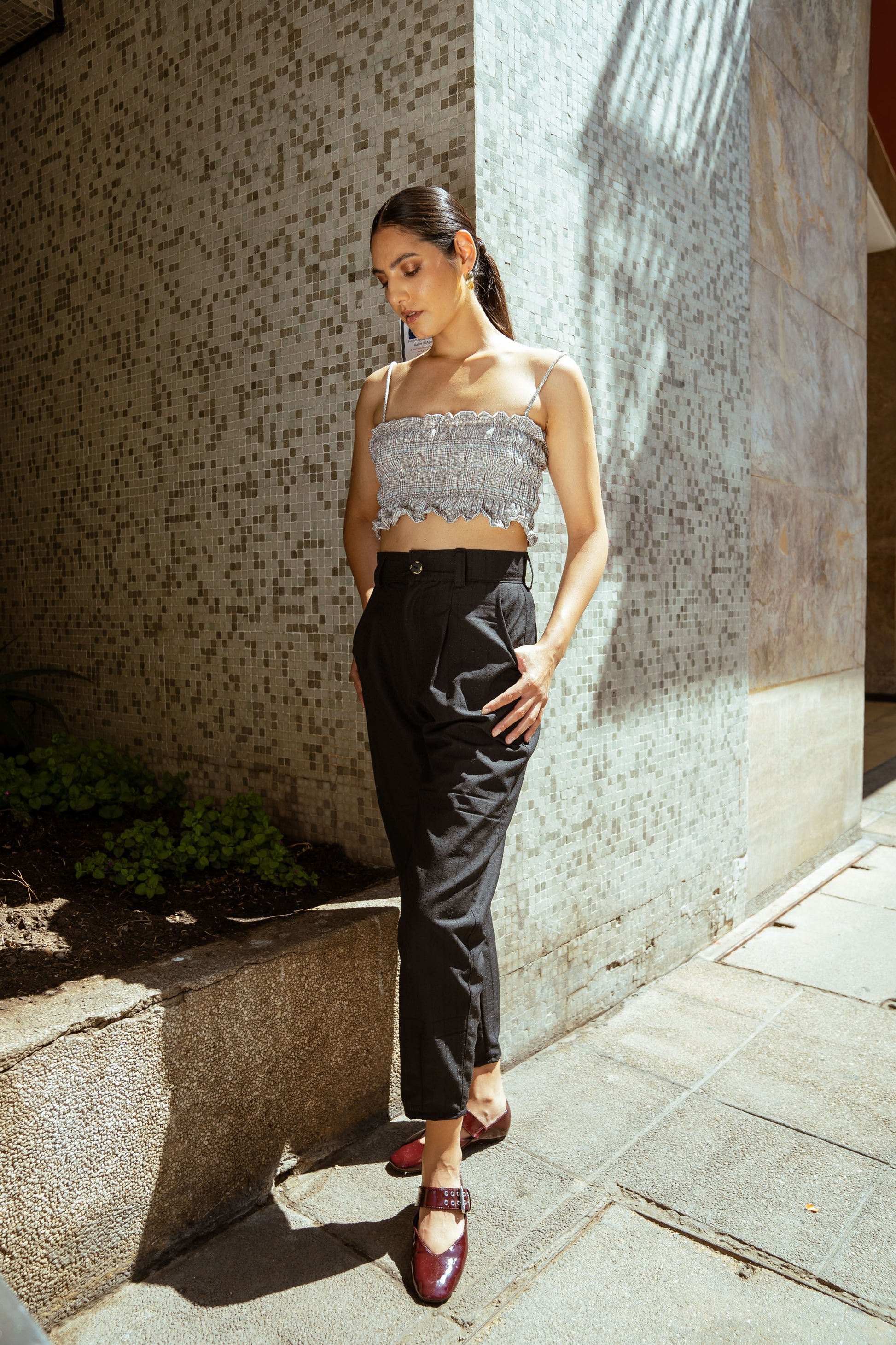 Pantalón con pinzas, pasadores para cinturón, bolsillos delanteros y traseros.
