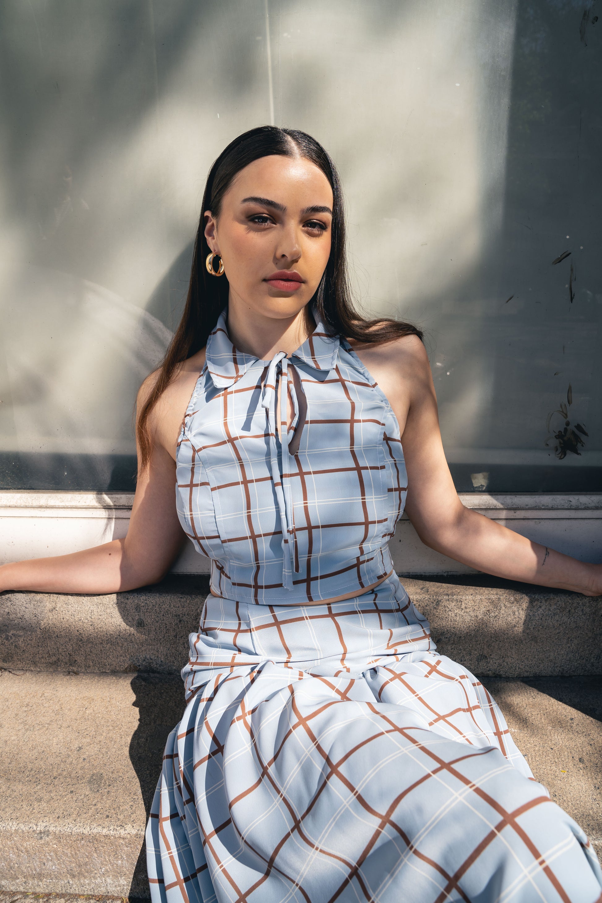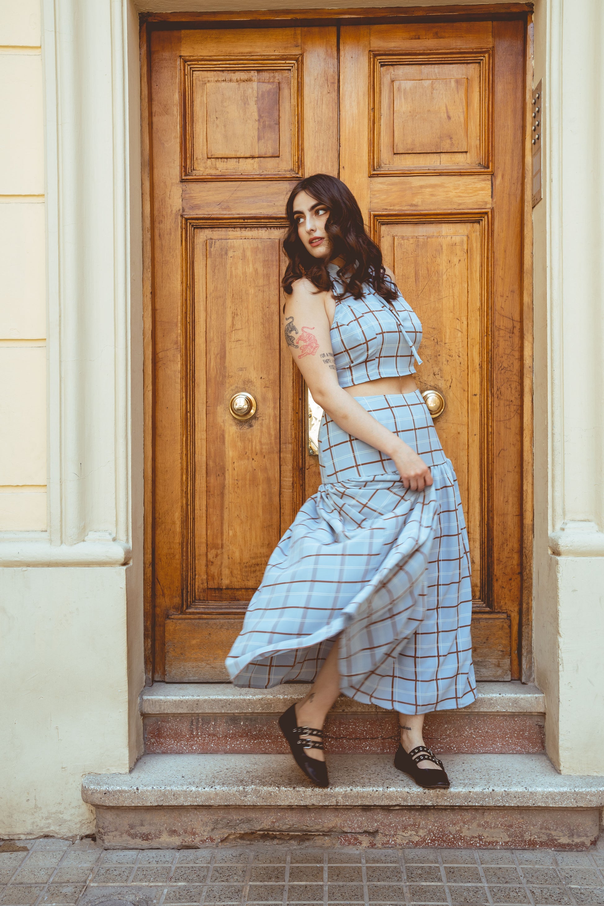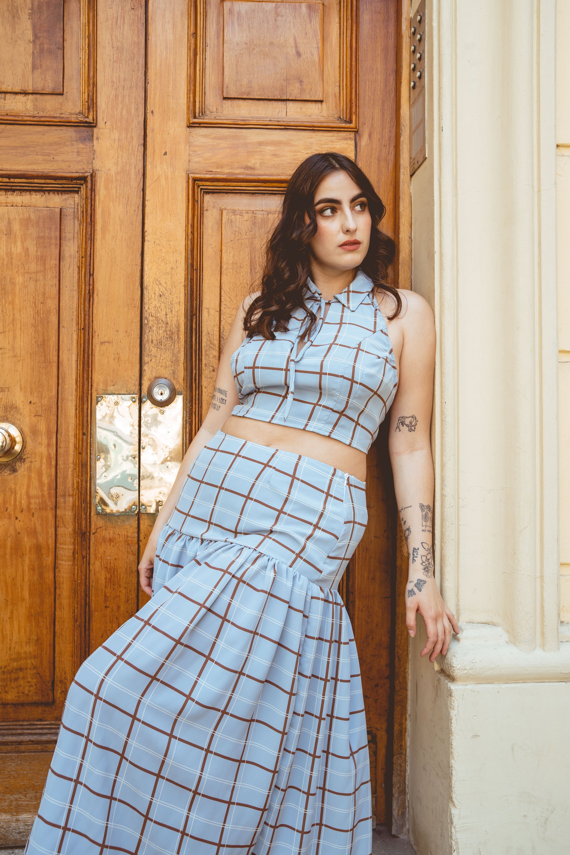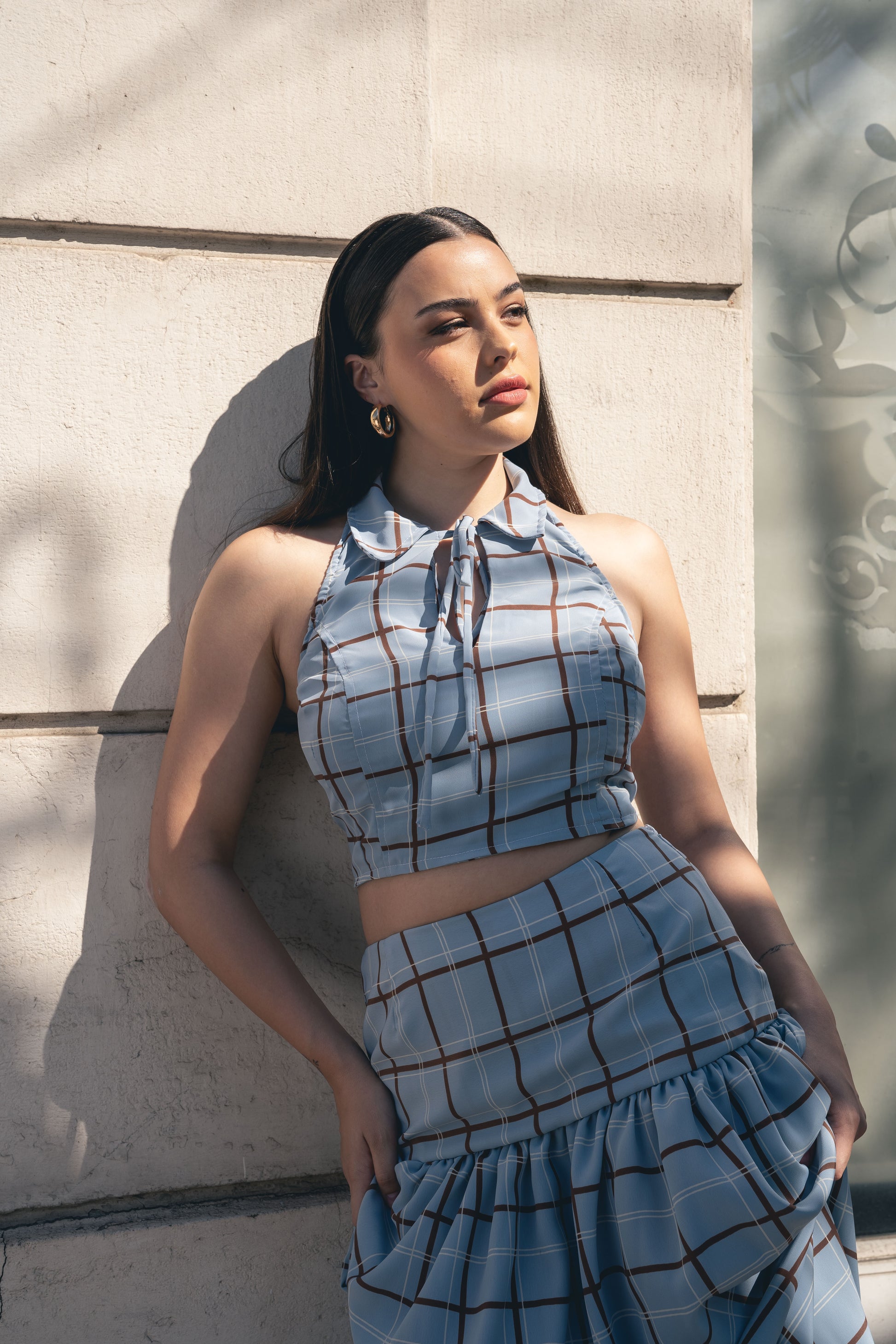 Top cuello camisero con laso, con elastico en el costado del busto, sin espalda y con amarras en la espalda.